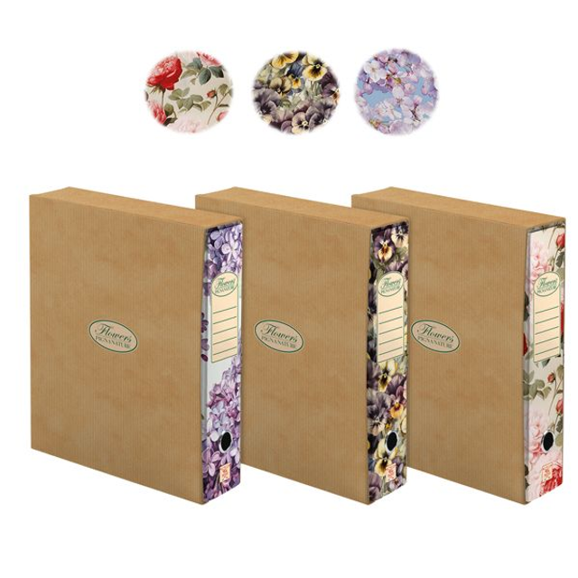 Registratore protocollo dorso 8cm con custodia linea Pigna Nature Flowers . Formato esterno cm 28,5x35. In cartone rivestito con carta uso mano stampata a motivi floreali.