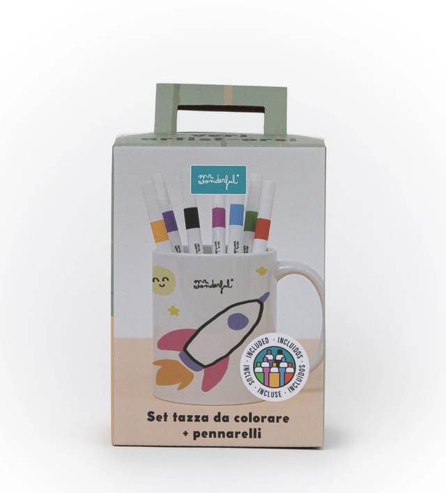 Set creativo di Mr. Wonderful che include una tazza bianca da colorare e 7 pennarelli colorati: arancione, giallo, rosso, lilla, blu, nero e verde. Ideale per personalizzare la tazza e creare un regalo unico e speciale.